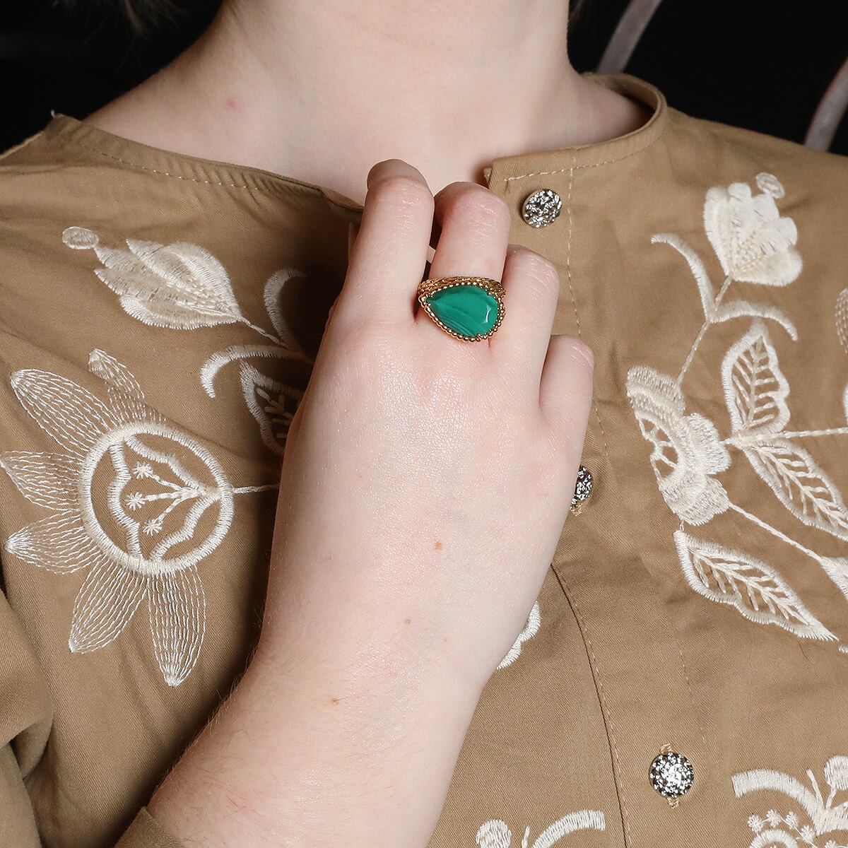 Bague en or jaune grand modèle, à décor d’écailles, ornée d’une malachite facettée en poire dans un entourage à décor perlé. Signée et numérotée.