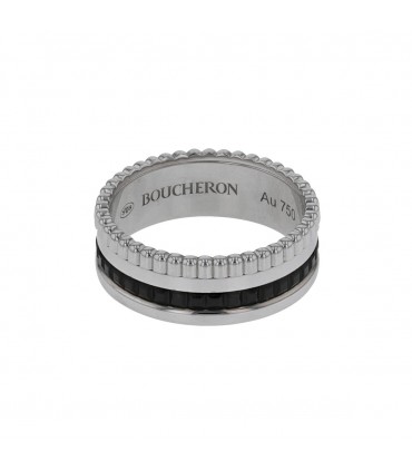 Bague en or blanc et PVD noir, stylisant 4 anneaux travaillés en relief aux motifs lisse poli, clous de Paris et godrons. Signée et numérotée.