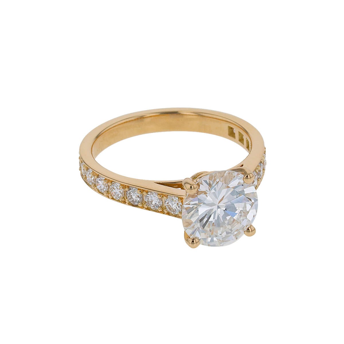 Bague en or jaune, centrée d’un diamant taille rond facetté de 2,08 ct épaulé de deux lignes de diamants. Accompagné d’un certificat LFG attestant d’un diamant taille rond facetté de 2,08 ct, couleur G, pureté SI1.