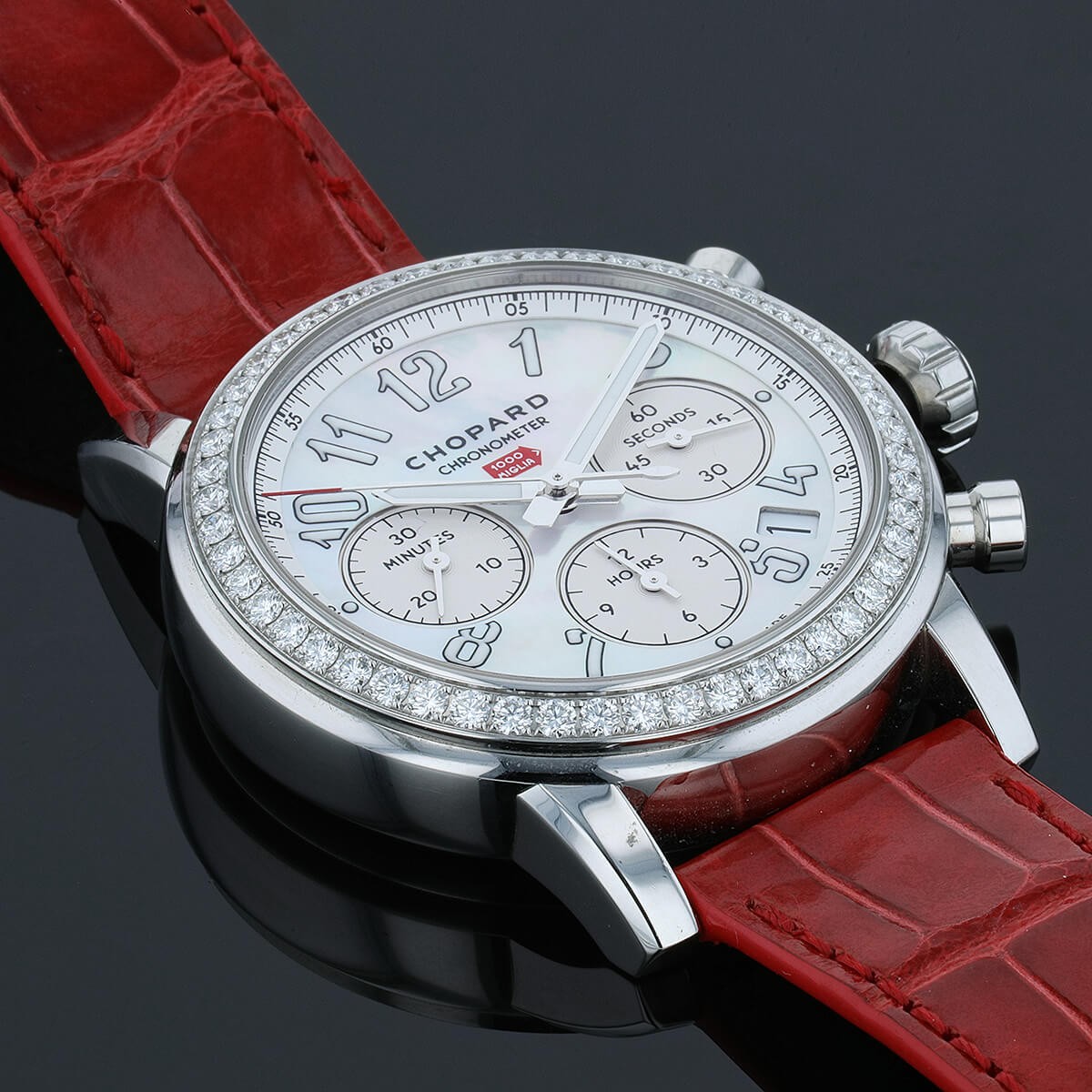 Montre chronographe en acier, cadran en nacre 3 compteurs avec chiffres arabes luminescents, affichage de la date par guichet 4 heures 30, chemin de fer pour les minutes, lunette sertie de diamants. Mouvement automatique. Bracelet signé neuf en crocodile rouge avec boucle ardillon en acier. Signée et numérotée. Accompagnée d’un bracelet en caoutchouc noir neuf à décor de pneu.