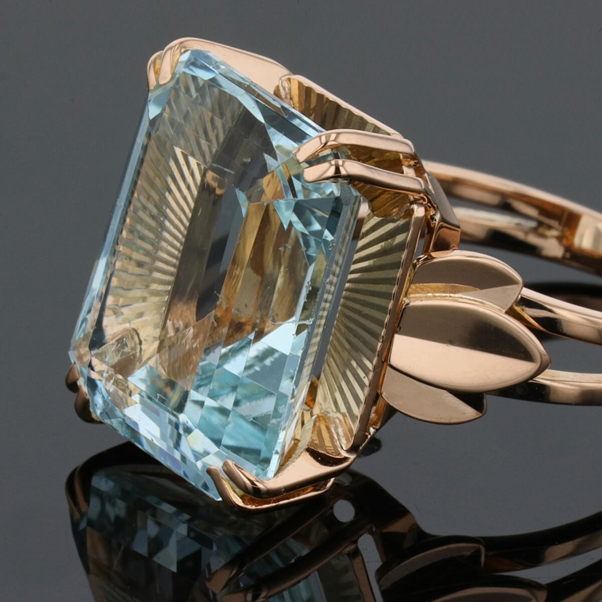 Bague en or jaune, sertie d’une aigue-marine taille émeraude à pans coupés épaulée de décor à motifs de feuillages. Légères égrisures sur pierre.