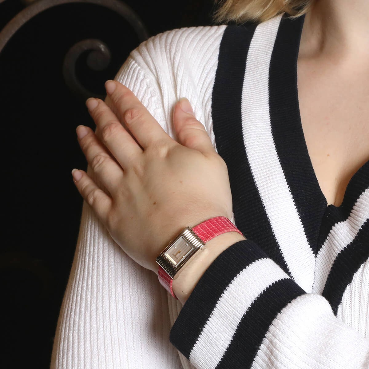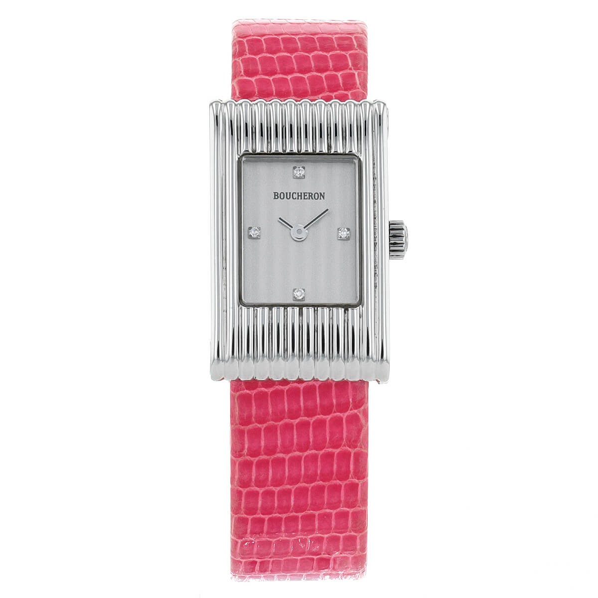 Montre bracelet de femme en acier, cadran argenté stylisé avec index diamants, lunette godronnée. Mouvement quartz. Bracelet interchangeable en lézard rose avec fermoir invisible à glissière. Signée et numérotée. Accompagnée de 4 bracelets supplémentaires de couleurs marron, noir, camel et vert.