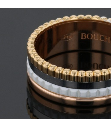 Bague 4 tons d'or, stylisant 4 anneaux travaillés en relief aux motifs lisse poli, clous de Paris en céramique blanche et godrons. Signée et numérotée.
