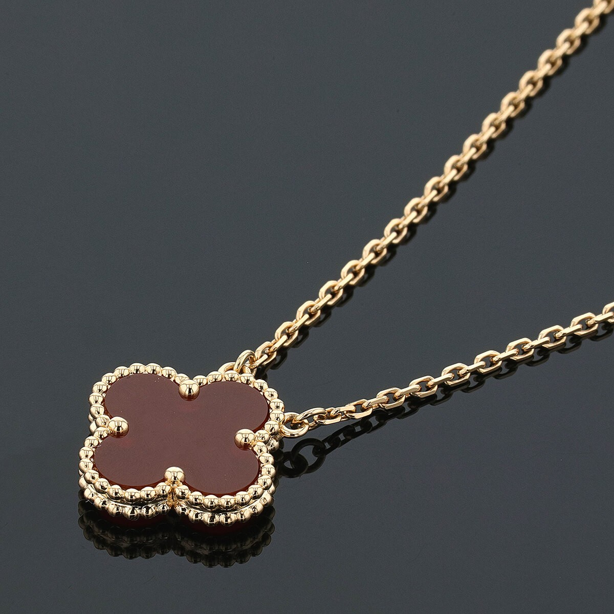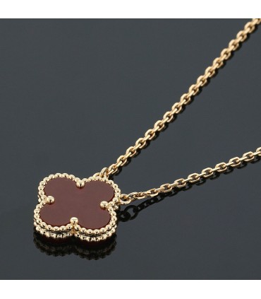 Collier en or jaune, maille forçat, centré d’un motif Alhambra en cornaline rehaussé d’une fine bordure perlée. Signé et numéroté.
