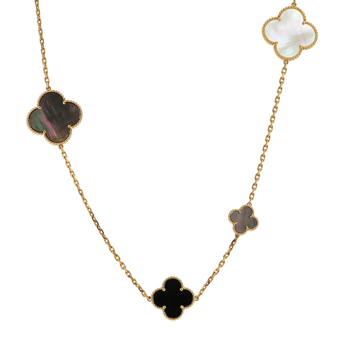 Sautoir en or jaune, maille forçat, ponctué de 16 motifs Alhambra de différentes tailles en nacre blanche, nacre grise et onyx, agrémenté d’un fermoir invisible. Signé et numéroté.