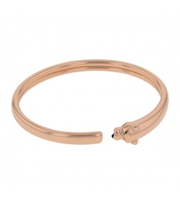 Bracelet flexible en or rose, stylisant une tête de panthère, les yeux en grenats tsavorites et le nez en onyx. Signé et numéroté.