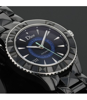 Montre bracelet de femme en acier, cadran noir rehaussé de saphirs avec chiffre romain et index appliqués, lunette appliquée de motifs pyramidales en céramique noire. Fond transparent dévoilant son mouvement automatique. Bracelet acier et céramique noire, maillons articulés avec boucle déployante en acier. Signée et numérotée. Accompagné d’un bracelet en cuir métallisé rose signé avec boucle ardillon en acier. Édition limitée à 188 modèles.