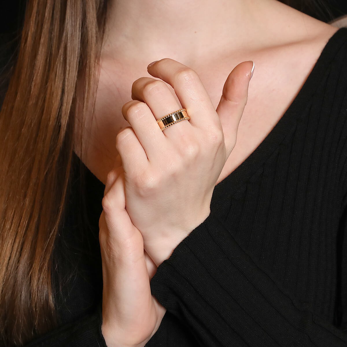 Bague en or jaune, gravée “Van Cleef & Arpels”, rehaussée de bordures perlées. Signée et numérotée.