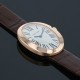 Montre bracelet de femme petit modèle en or rose, cadran argenté rayonnant avec chiffres romains peints. Mouvement quartz. Bracelet signé en cuir marron avec boucle ardillon signée en or rose. Signée et numérotée.