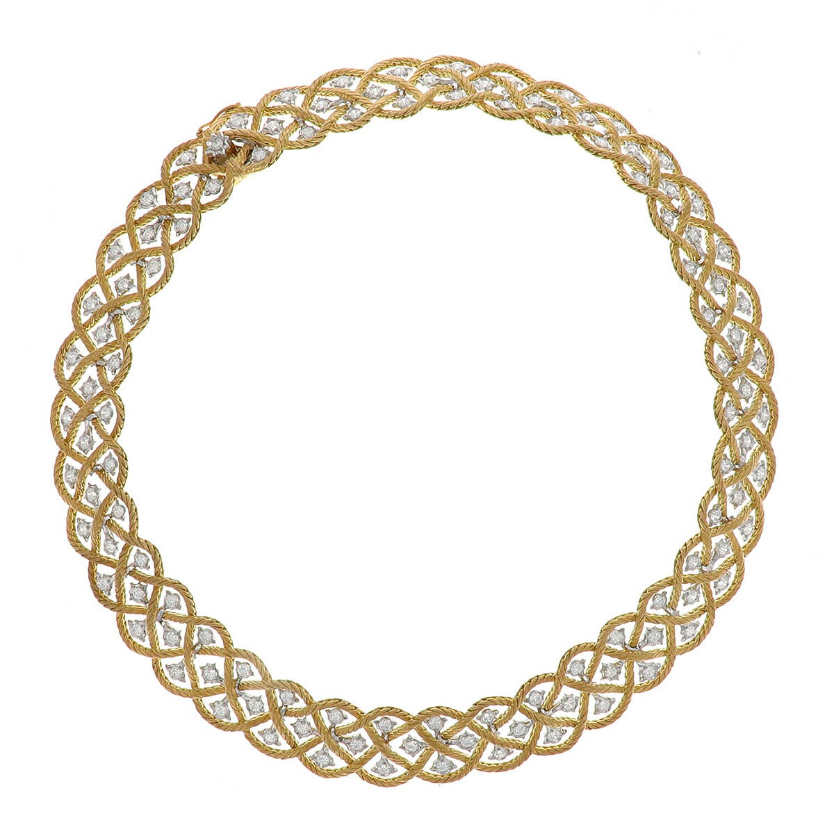 Collier 2 tons d’or, composé d’un motif de cordages ajourés en or blanc rehaussé de diamants ronds facettés sertis sur or blanc, agrémenté d’un fermoir à cliquet avec huit de sécurité. Signé.