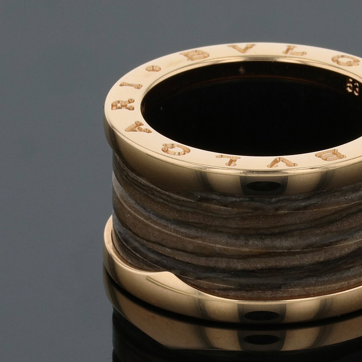Bague en or rose et marbre marron, stylisant un large anneau en spirale gravé Bvlgari. Signée et numérotée.