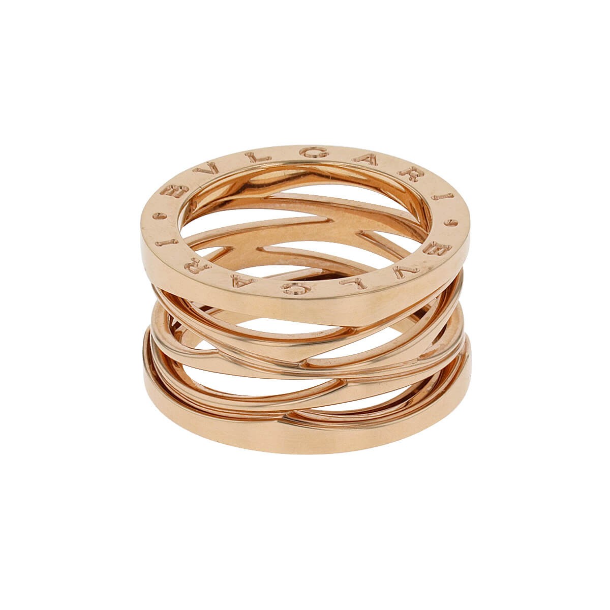 Bague en or rose, stylisant un large anneau ajouré gravé Bvlgari. Signée et numérotée.