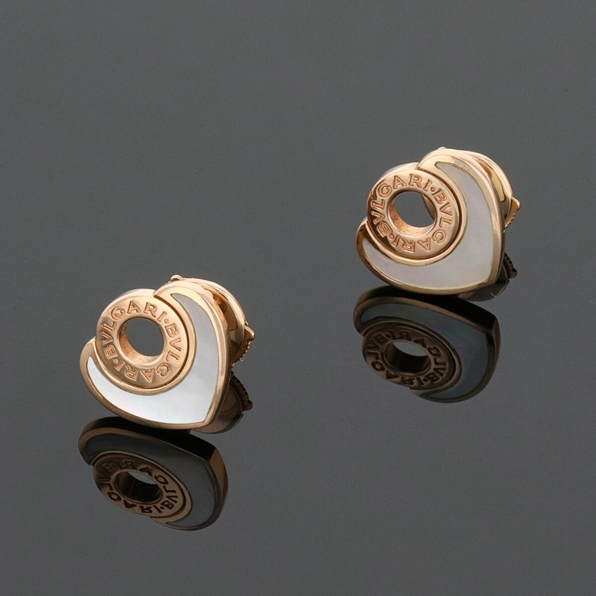Boucles d’oreilles en or rose, stylisant un coeur en nacre blanche rehaussé d’une pastille gravée “Bvlgari”. Signées et numérotées.