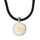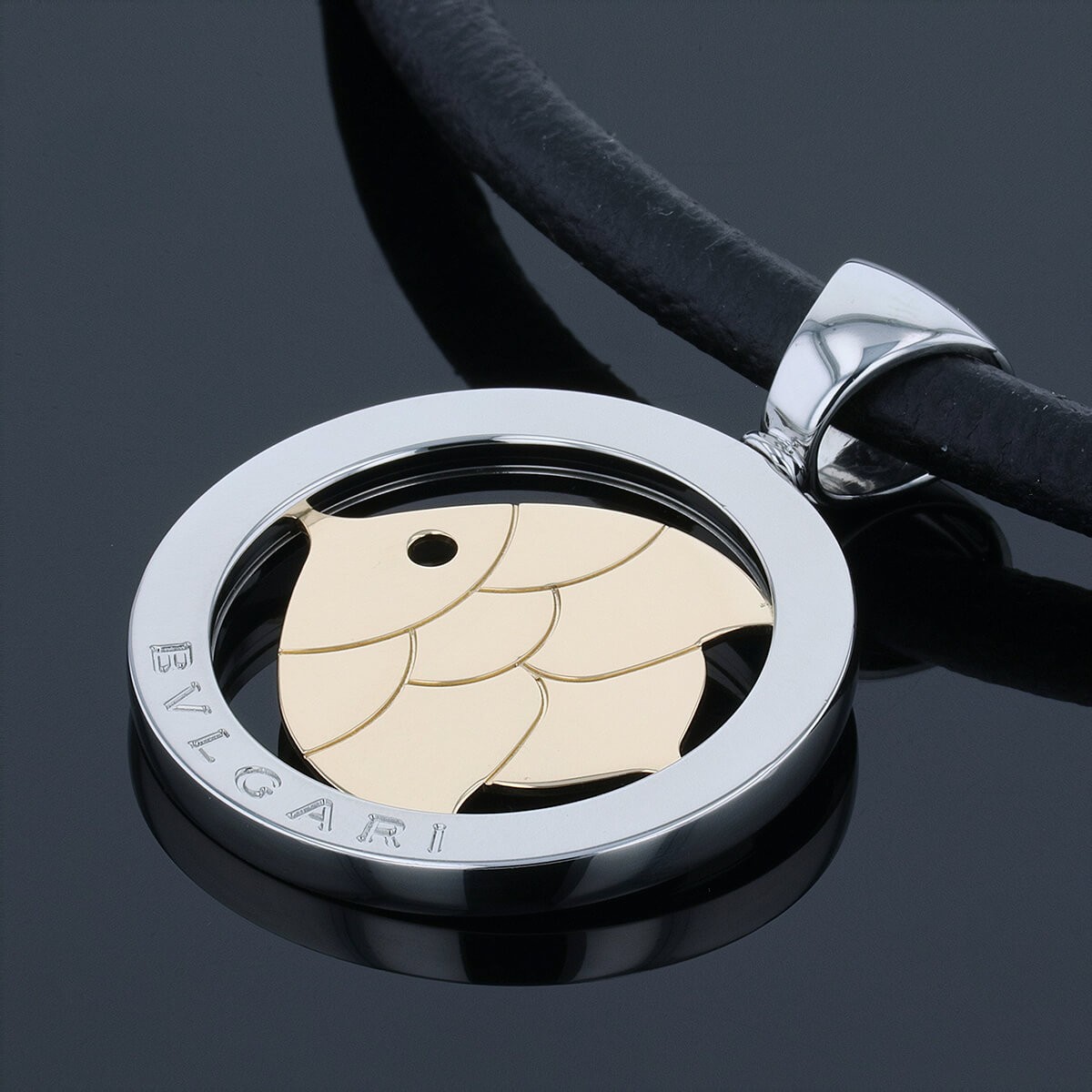 Collier en acier et or jaune, composé d’un cordon en cuir retenant un pendentif ajouré stylisant un poisson en or jaune dans un cercle gravé “Bvlgari” en acier. Signé.