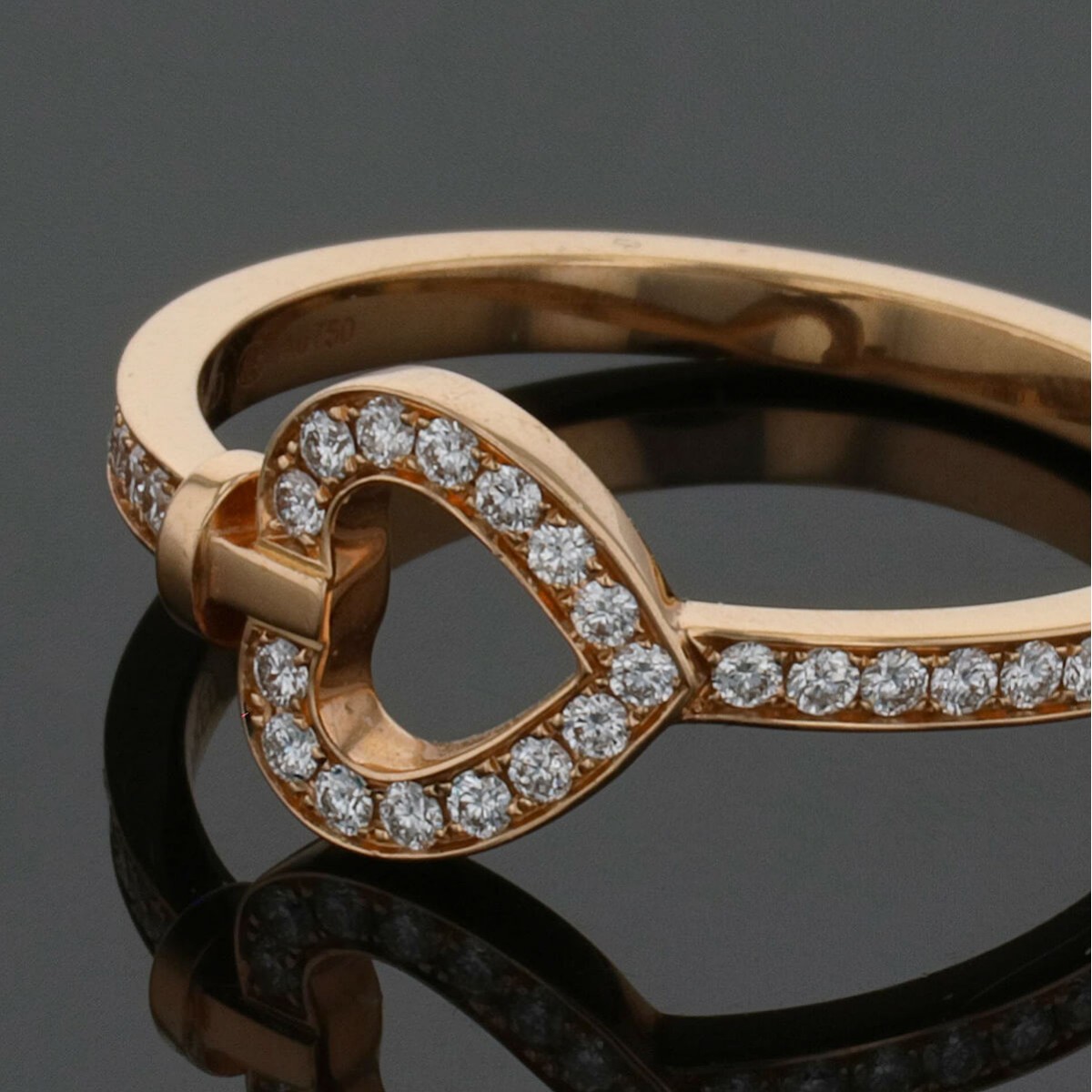 Bague en or rose, centrée d’un coeur ajouré serti de diamants et épaulé de deux pavages de diamants. Signée et numérotée.