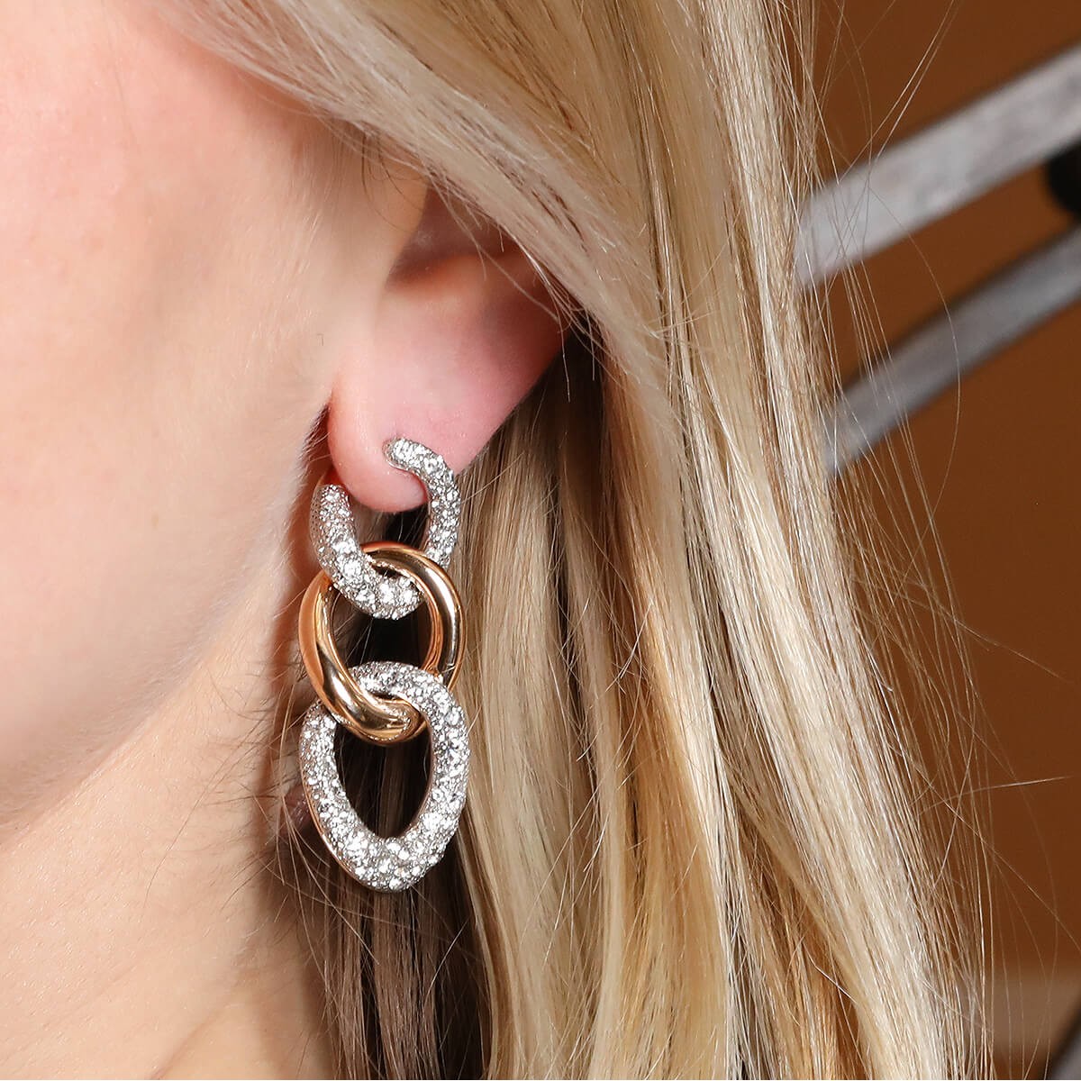 Boucles d’oreilles en or rose, composées de 3 maillons gourmette dont deux sertis de diamants sur or blanc. Signées et numérotées.