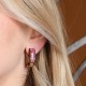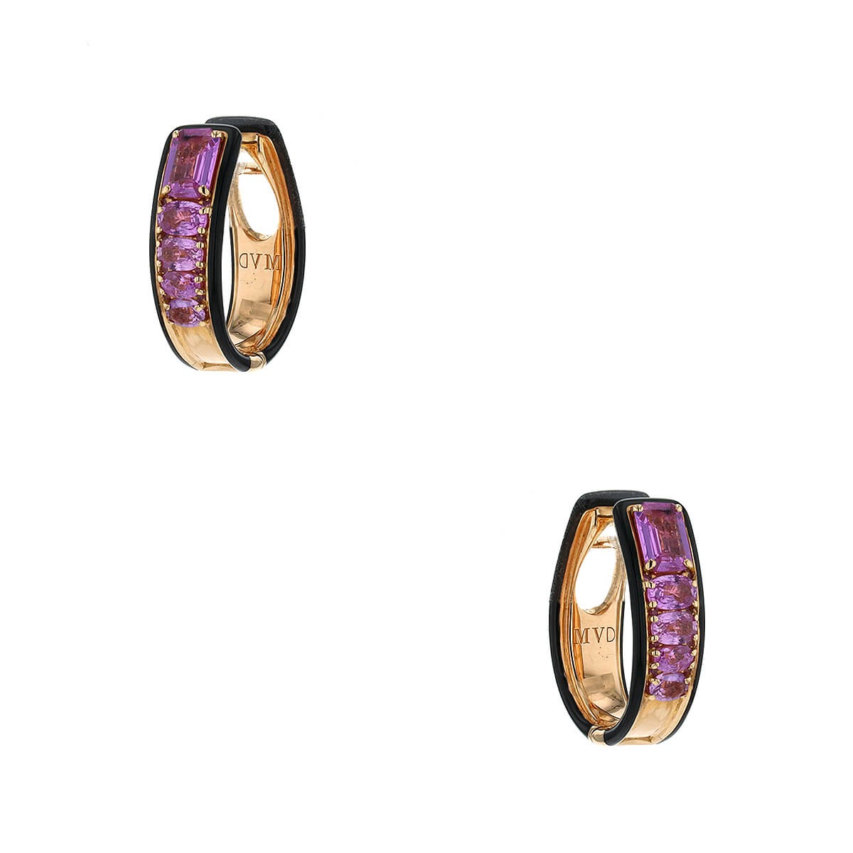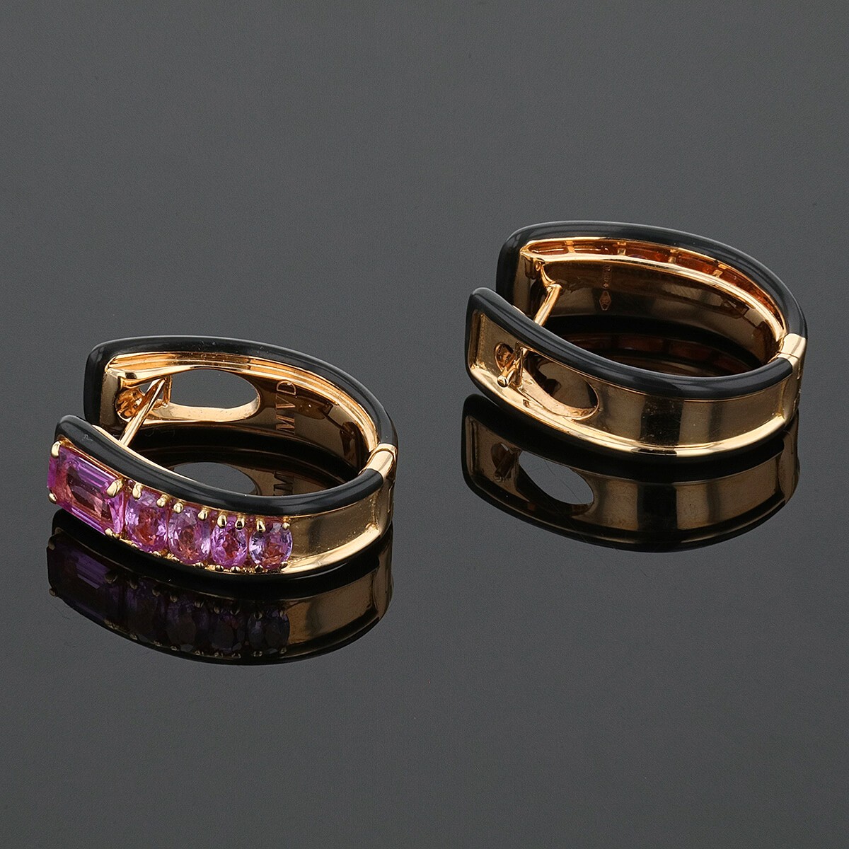 Boucles d’oreilles en or rose, serties de saphirs roses taille émeraude et taille ovale, rehaussés d’un contour en céramique noire.