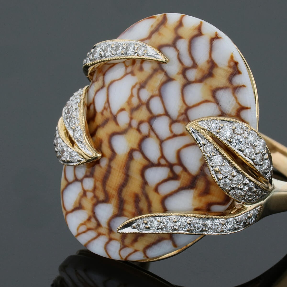 Bague en or jaune, ornée d’un coquillage entrelacé de lignes de diamants.