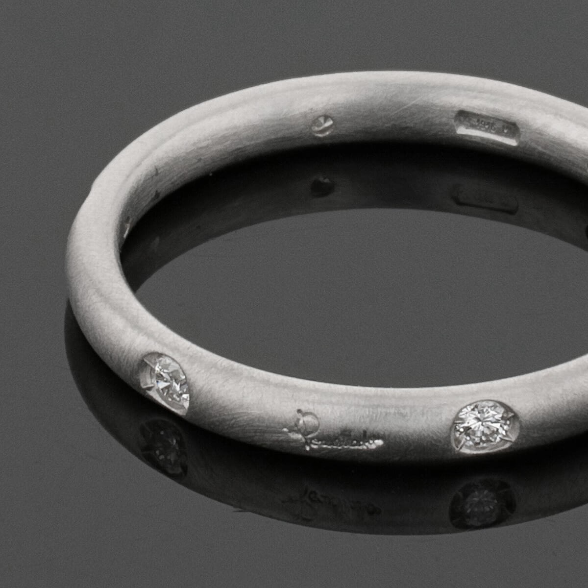 Alliance en or blanc sablé ornée de 6 diamants. Signée.
