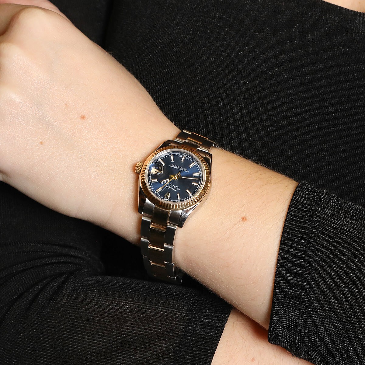 Montre bracelet de femme en or jaune et acier, cadran bleu rayonnant avec index appliqués, chemin de fer pour les minutes, affichage de la date par guichet à 3 heures, lunette cannelée en or jaune. Mouvement automatique. Bracelet or jaune et acier, maillons oyster avec boucle déployante réglable en or et acier. Signée et numérotée.