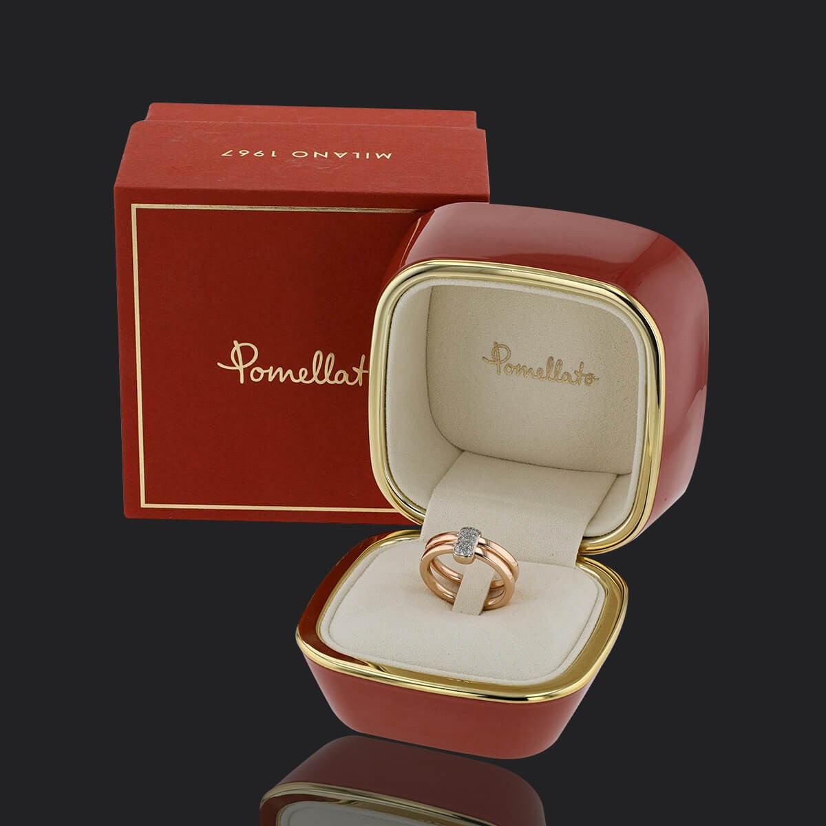 Bague en or rose, composée de deux anneaux retenus par un lien serti de diamants sur or blanc. Signée et numérotée.