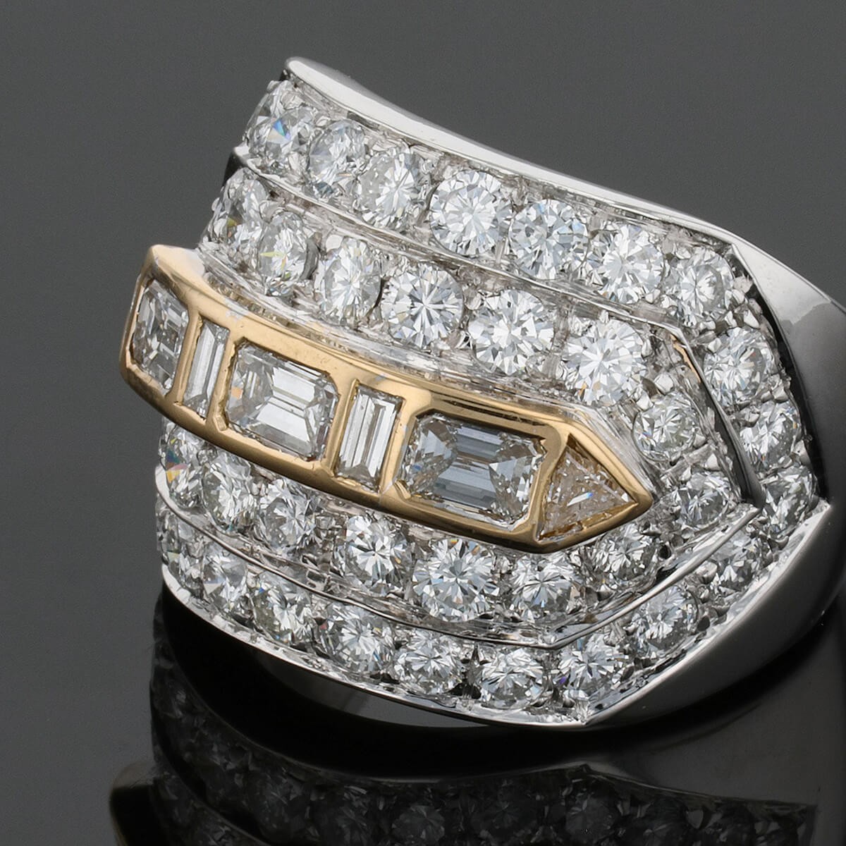 Bague 2 tons d’or, centrée d’un important pavage de diamants rehaussé d’une ligne de diamants taille princesse, taille baguette et taille émeraude sertis sur or jaune.
