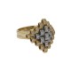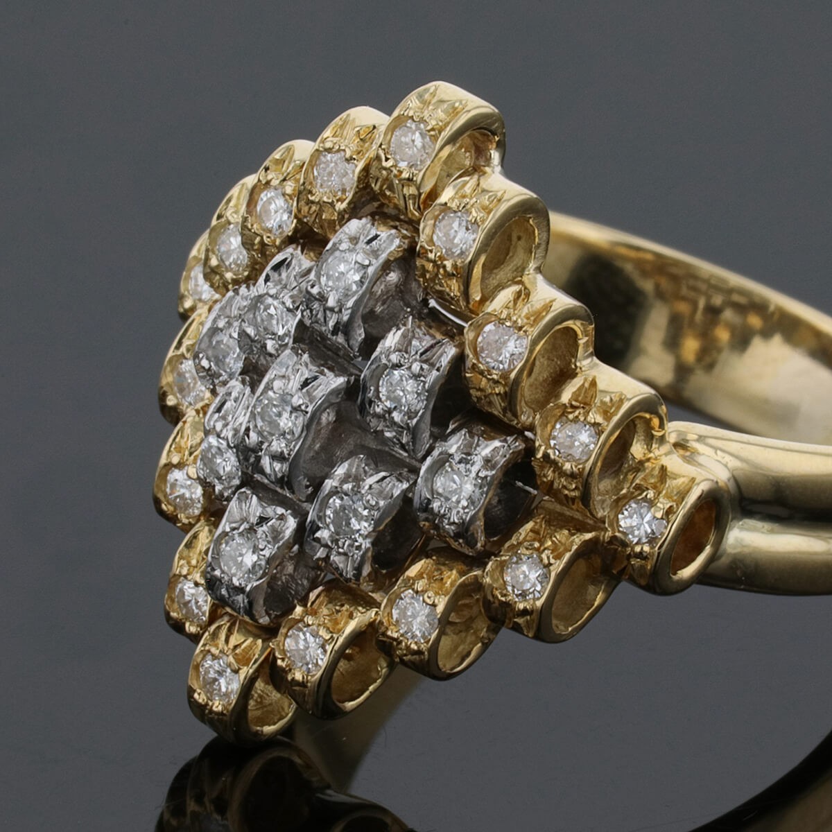 Bague 2 tons d’or, centrée d’un ensemble d’anneaux en or jaune et or blanc rehaussés de diamants et formant un motif de losange en relief, retenu par un anneau à motif godronné.
