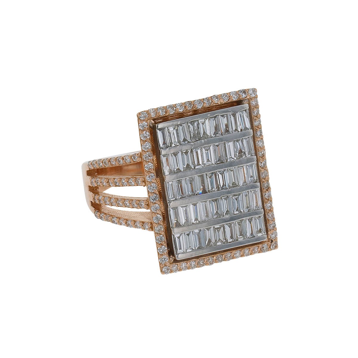 Bague 2 tons d’or, centrée d’un plateau rectangulaire en or blanc pavé de diamants taille baguette en serti rails, rehaussé d’une monture en or rose partiellement sertie de diamants.