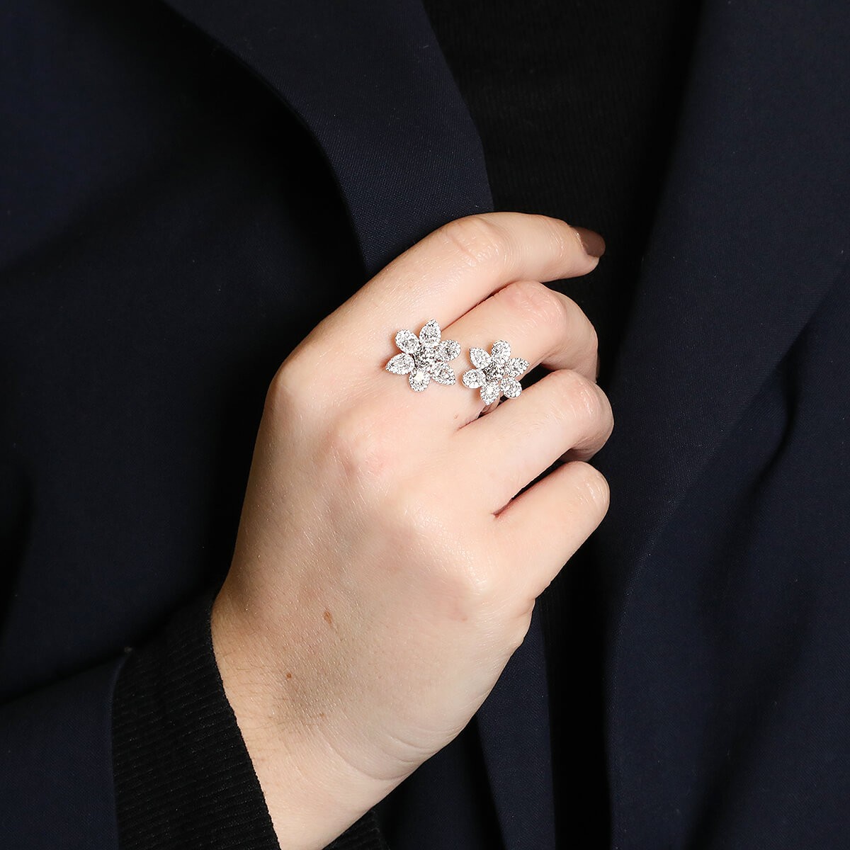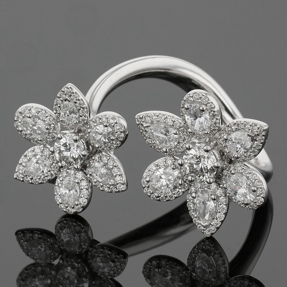 Bague en or blanc, centrée de deux motifs de fleurs serties de diamants taille poire, taille ovale et taille rond facetté.