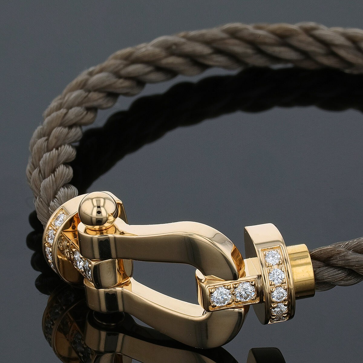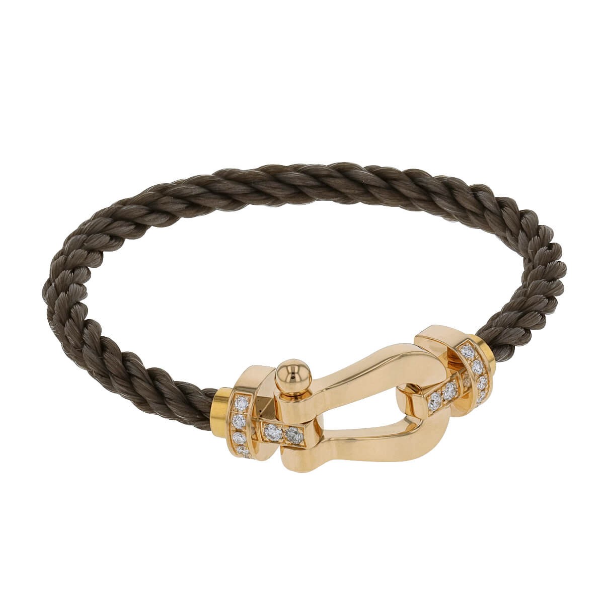 Bracelet grand modèle, composé d’une manille en or jaune partiellement sertie de diamants et d’un câble amovible taupe torsadé. Accompagné de 4 bracelets supplémentaires rose, bleu marine, vert foncé et blanc. Signé et numéroté.