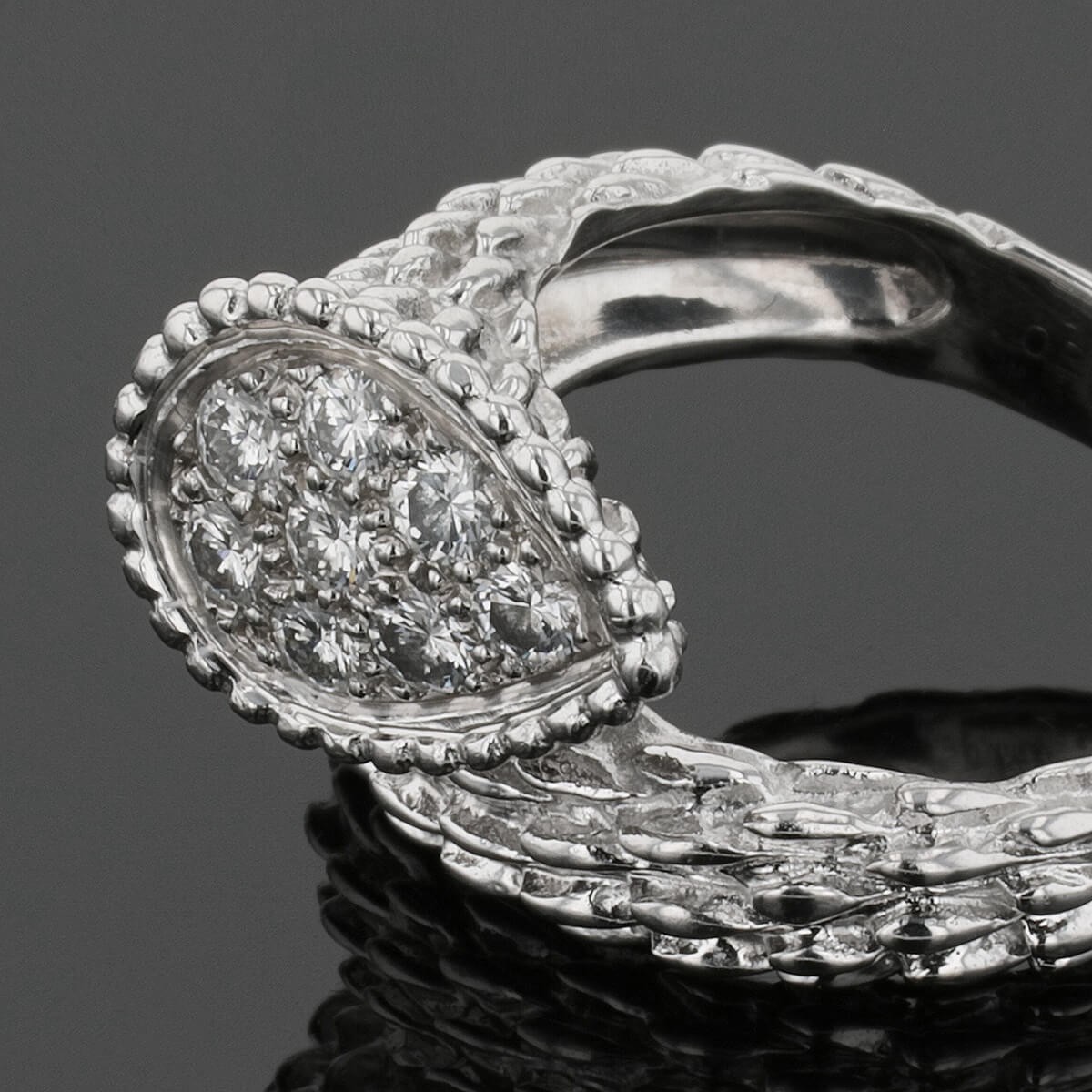 Bague en or blanc, petit modèle, à décor d’écailles et d’un motif perlé en poire orné d’un pavage de diamants. Signée et numérotée.