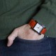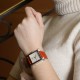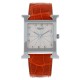 Montre bracelet grand modèle en acier, cadran argenté stylisé avec chiffres arabes, affichage de la date par guichet à 3 heures, lunette à décor de ''H''. Bracelet en cuir orange signé avec boucle ardillon en acier. Signée et numérotée.