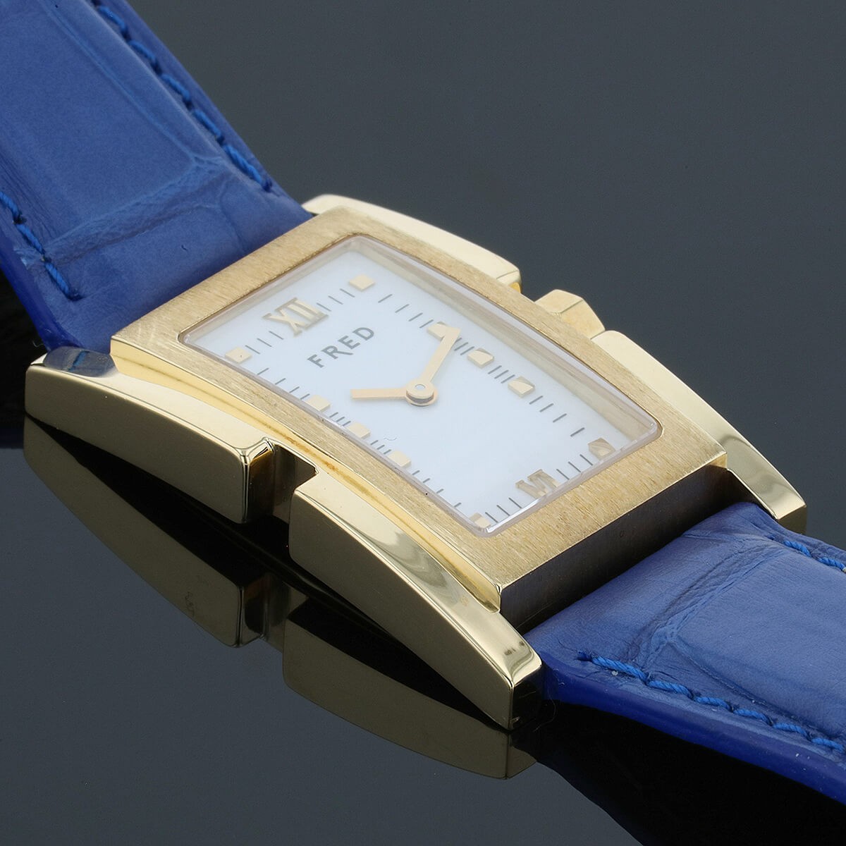 Montre bracelet en or jaune, cadran blanc avec chiffres romains et index appliqués, chemin de fer pour les minutes, lunette rectangulaire stylisée. Mouvement quartz. Bracelet en cuir bleu rapporté avec boucle ardillon en or jaune. Signée et numérotée.