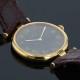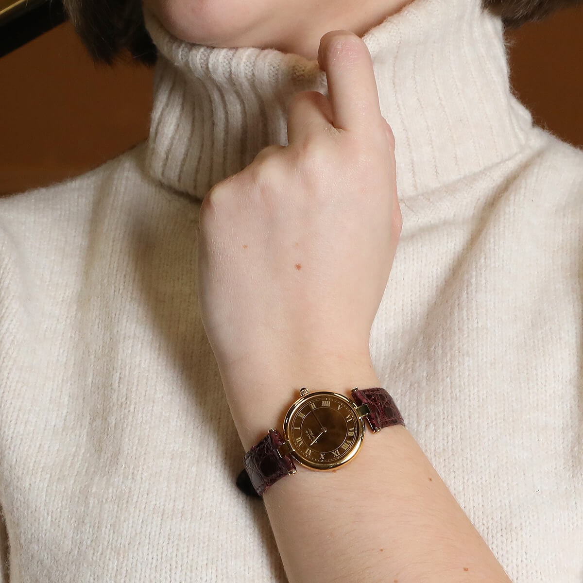Montre bracelet en vermeil, cadran marron moucheté, chiffres romains appliqués, chemin de fer pour les minutes. Mouvement quartz. Bracelet crocodile bordeaux usagé signé avec boucle ardillon en métal doré usagée. Signée et numérotée.