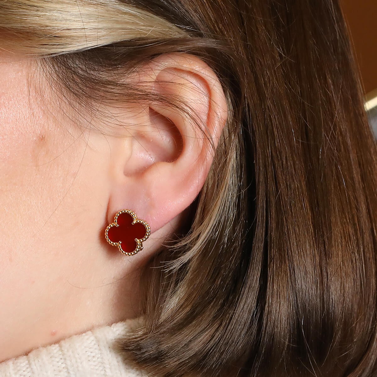Boucles d’oreilles en or jaune, stylisant le motif Alhambra en cornaline. Signées et numérotées.