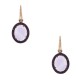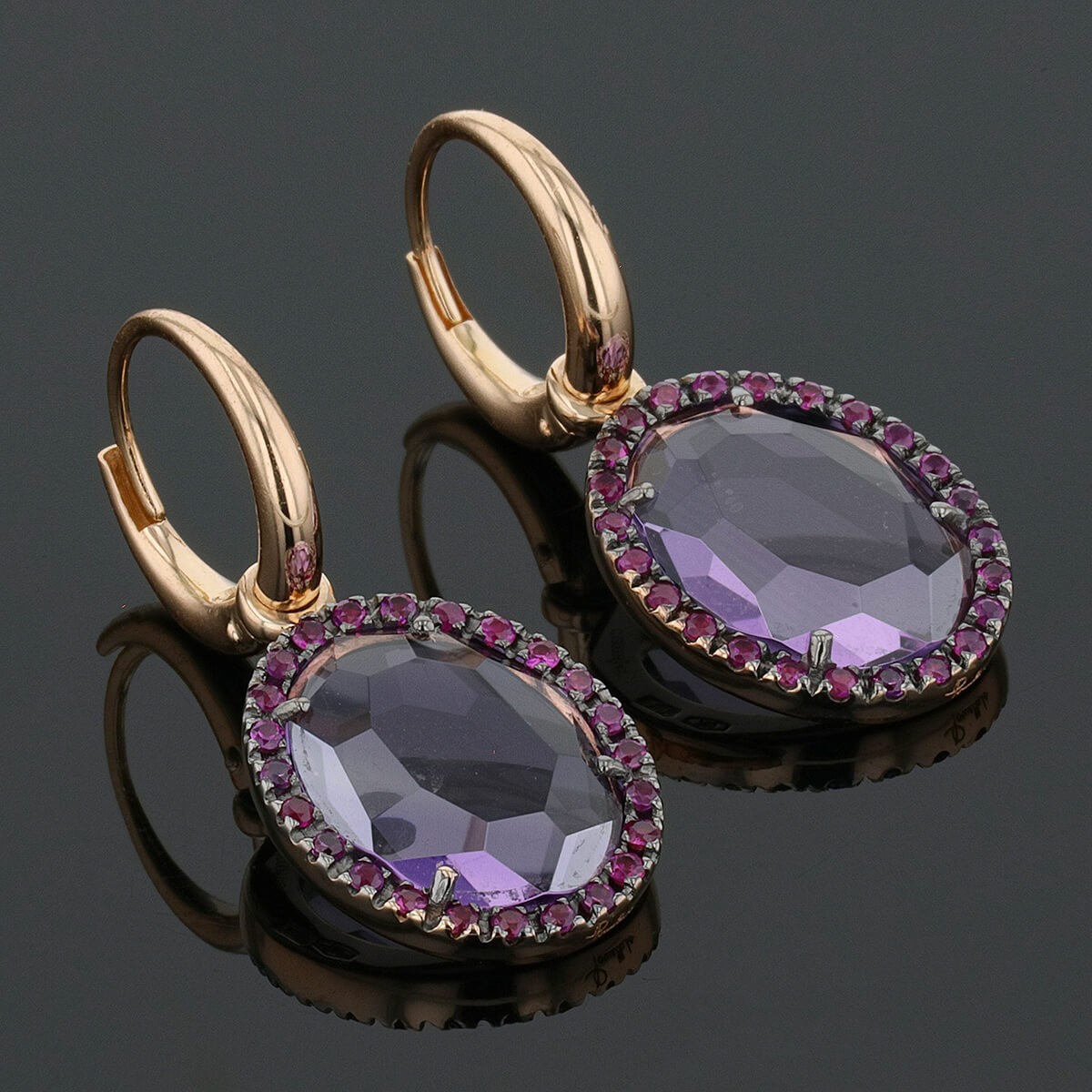 Boucles d’oreilles en or rose, ornées d’une améthyste facettée dans un entourage de rubis sertis sur de l’or rhodié noir. Signées et numérotées.