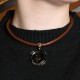 Collier en acier et or jaune, composé d’un cordon en cuir marron retenant un pendentif ajouré stylisant un coeur en or jaune dans un cercle gravé “Bvlgari” en acier. Signé.