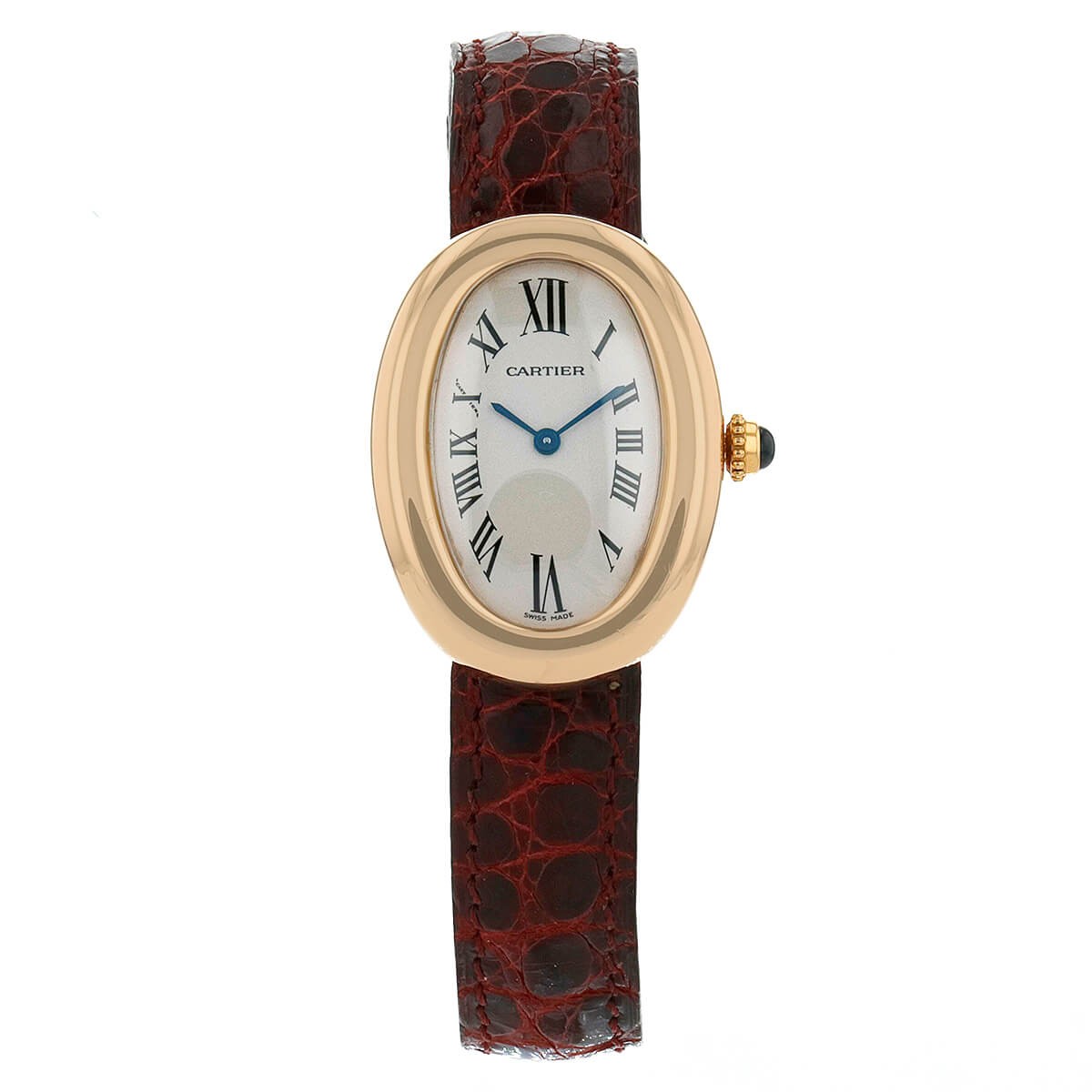 Montre bracelet de femme en or jaune, cadran crème avec chiffres romains peints, lunette godronnée. Mouvement quartz. Bracelet en crocodile bordeaux signé usagé avec boucle ardillon en or jaune. Signée et numérotée.