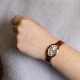 Montre bracelet de femme petit modèle en or rose, cadran argenté rayonnant avec chiffres romains peints. Mouvement quartz. Bracelet signé usagé en cuir cognac avec boucle ardillon signée en or rose. Signée et numérotée.