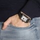 Montre bracelet d’homme en acier, boîtier réversible dévoilant d’un côté un cadran argenté avec chiffres arabes peints, indicateur jour et nuit à 2 heures, affichage de la phase de lune à 5 heures, indicateur de réserve de marche à 10 heures, l’autre côté du boîtier dévoilant son mouvement mécanique. Bracelet en acier boucle déployante réglable en acier. Signée et numérotée.