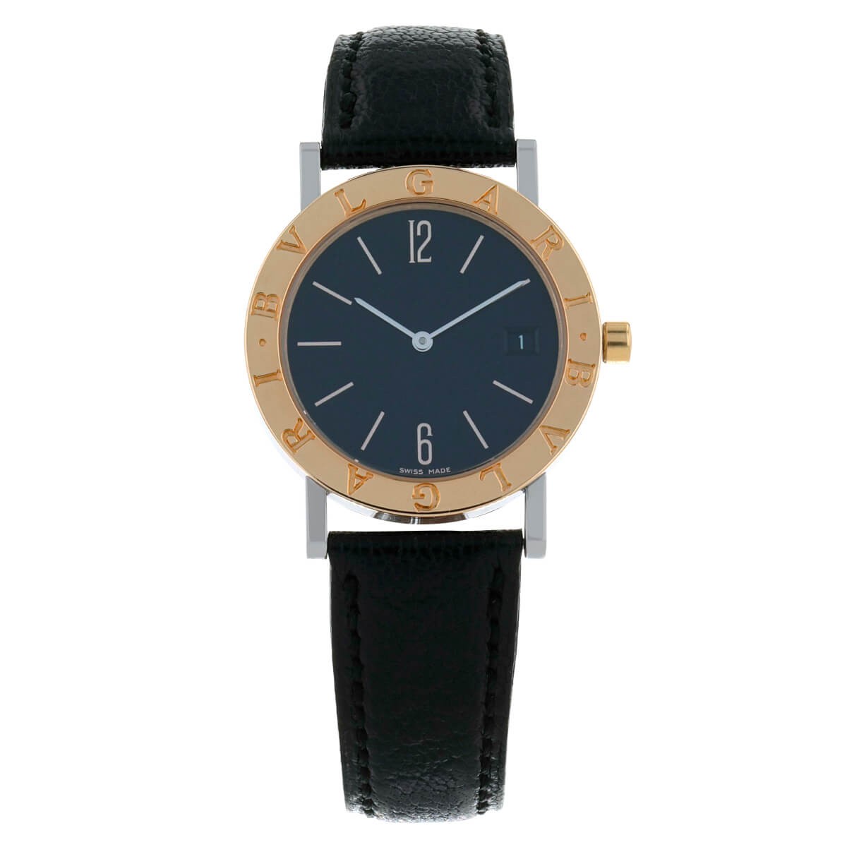 Montre bracelet de femme en or jaune et acier, cadran noir avec index et chiffres arabes appliqués, affichage de la date par guichet à 3 heures, lunette gravée “Bvlgari” en or jaune. Mouvement quartz. Bracelet signé usagé en cuir noir avec boucle déployante ardillon en acier signée. Signée et numérotée.