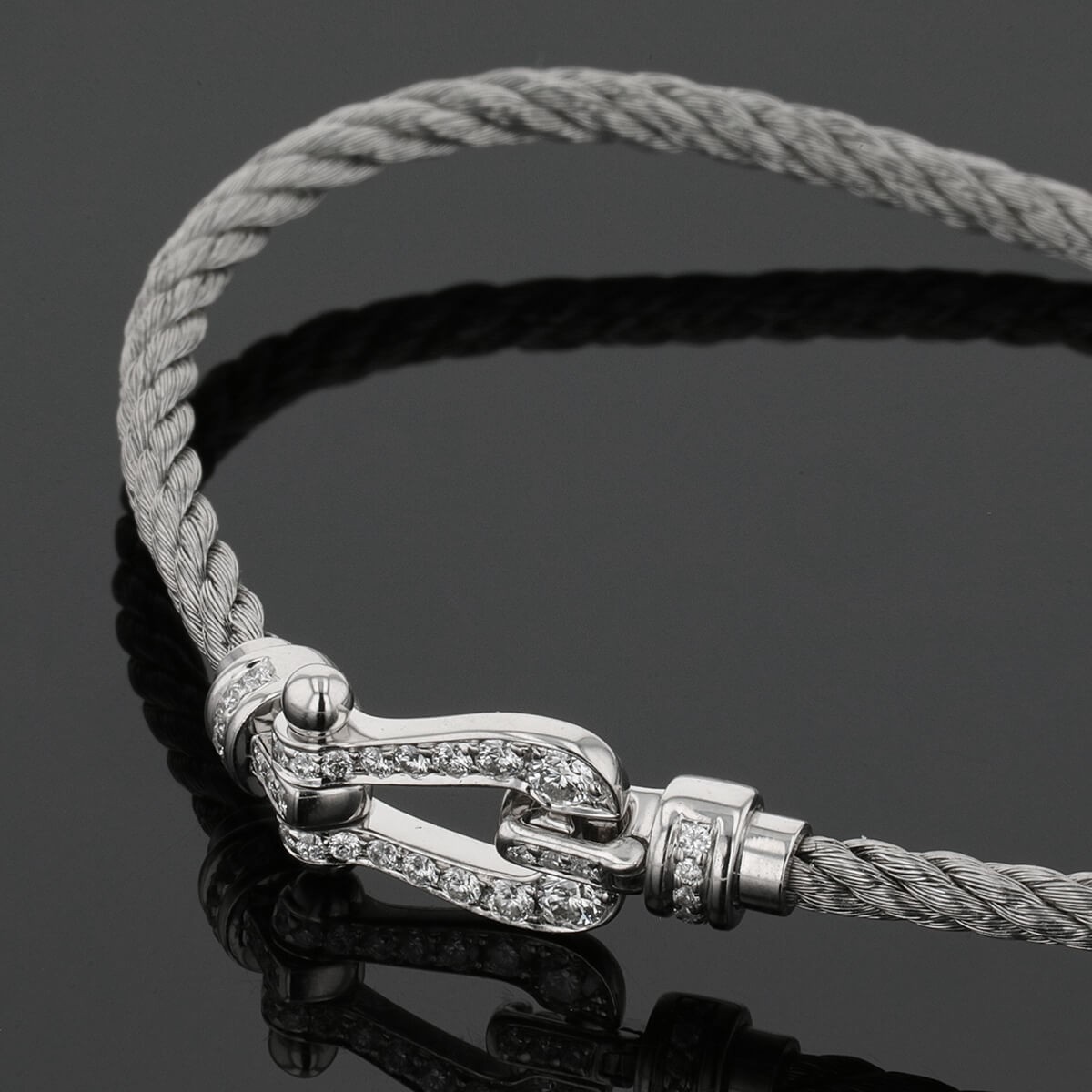 Bracelet moyen modèle, composé d’une manille en or blanc sertie de diamants et d’un câble en acier torsadé non amovible. Ancienne génération. Signé et numéroté.