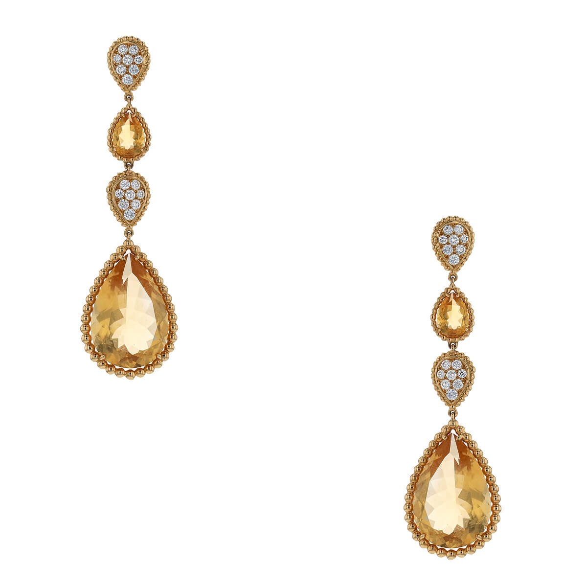 Boucles d’oreilles en or jaune, retenant deux citrines taillées en poire dans un entourage perlé. Signées et numérotées.