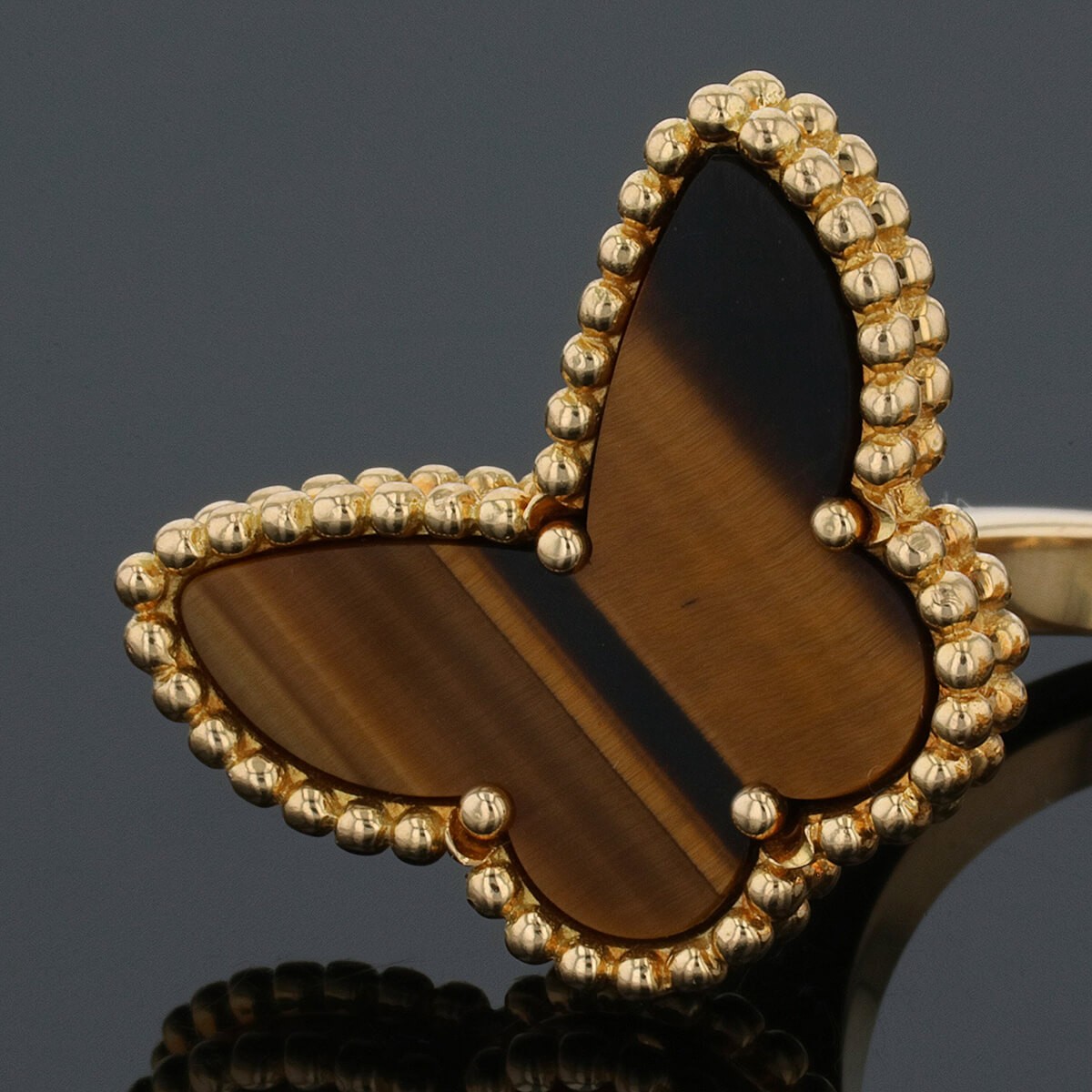 Bague entre les doigts en or jaune, ornée à gauche d’un motif de papillon en quartz oeil de tigre dans un entourage perlé et à droite d’un motif de trèfle en nacre blanche dans un entourage perlé. Signée et numérotée.