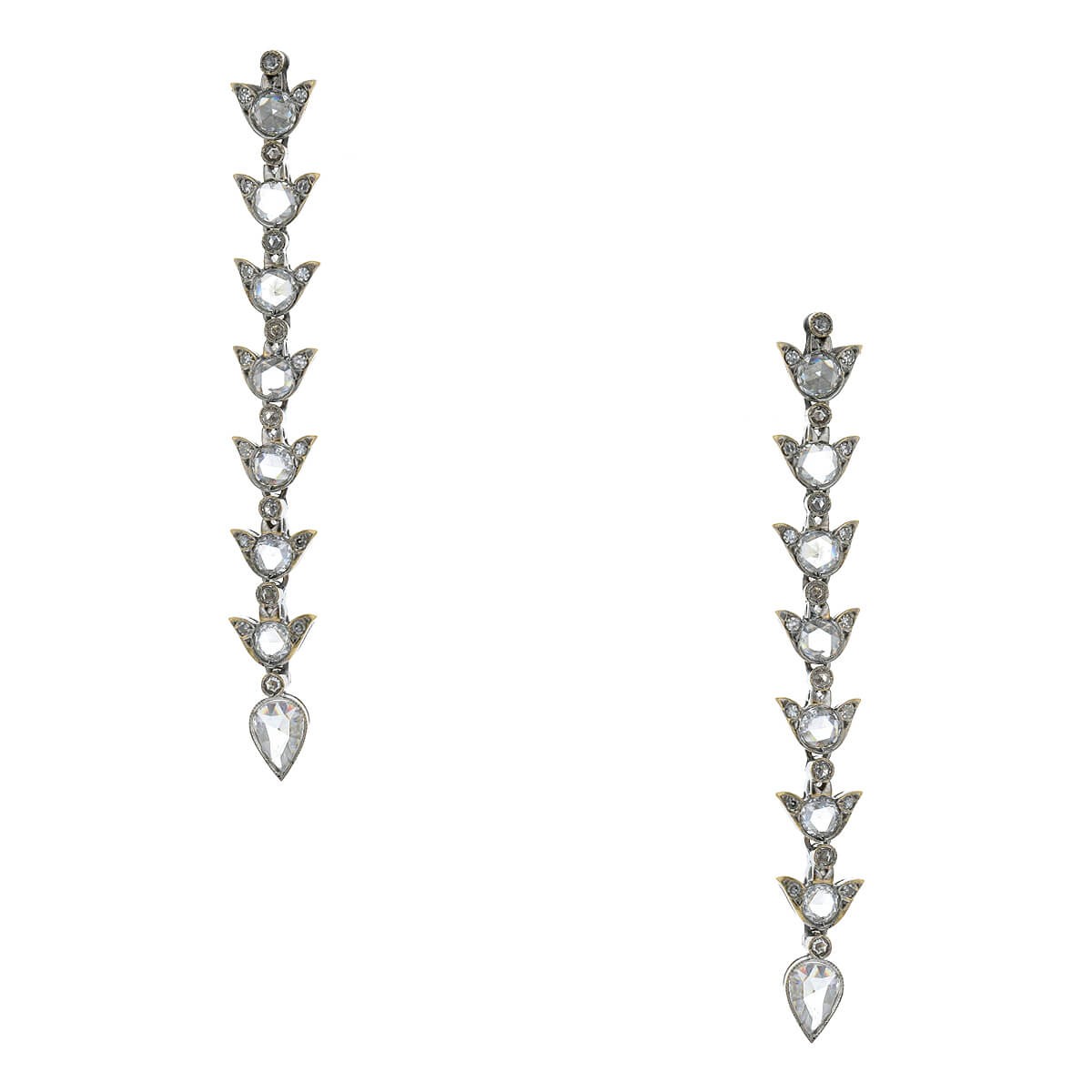 Boucles d’oreilles en or blanc, composées d’une ligne de 7 motifs sertis de diamants taille rose, ponctués de diamants taille rose en serti clos et terminés par un diamant taillé en poire facettée.
