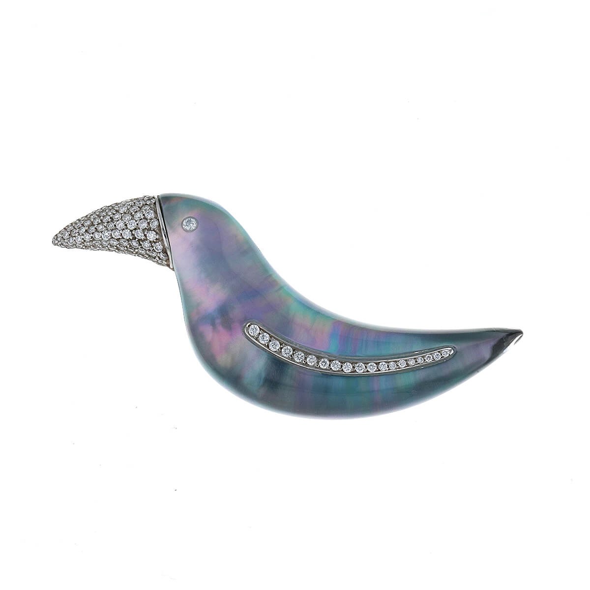 Broche 2 tons d’or, stylisant un oiseau en quartz cristal de roche serti sur une plaque de nacre grise rehaussé de diamants. Signée.
