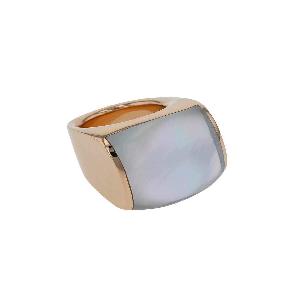 Bague en or jaune, composée d’un anneau oblique rehaussé d’un important cabochon de quartz serti sur de la nacre blanche. Signée et numérotée.