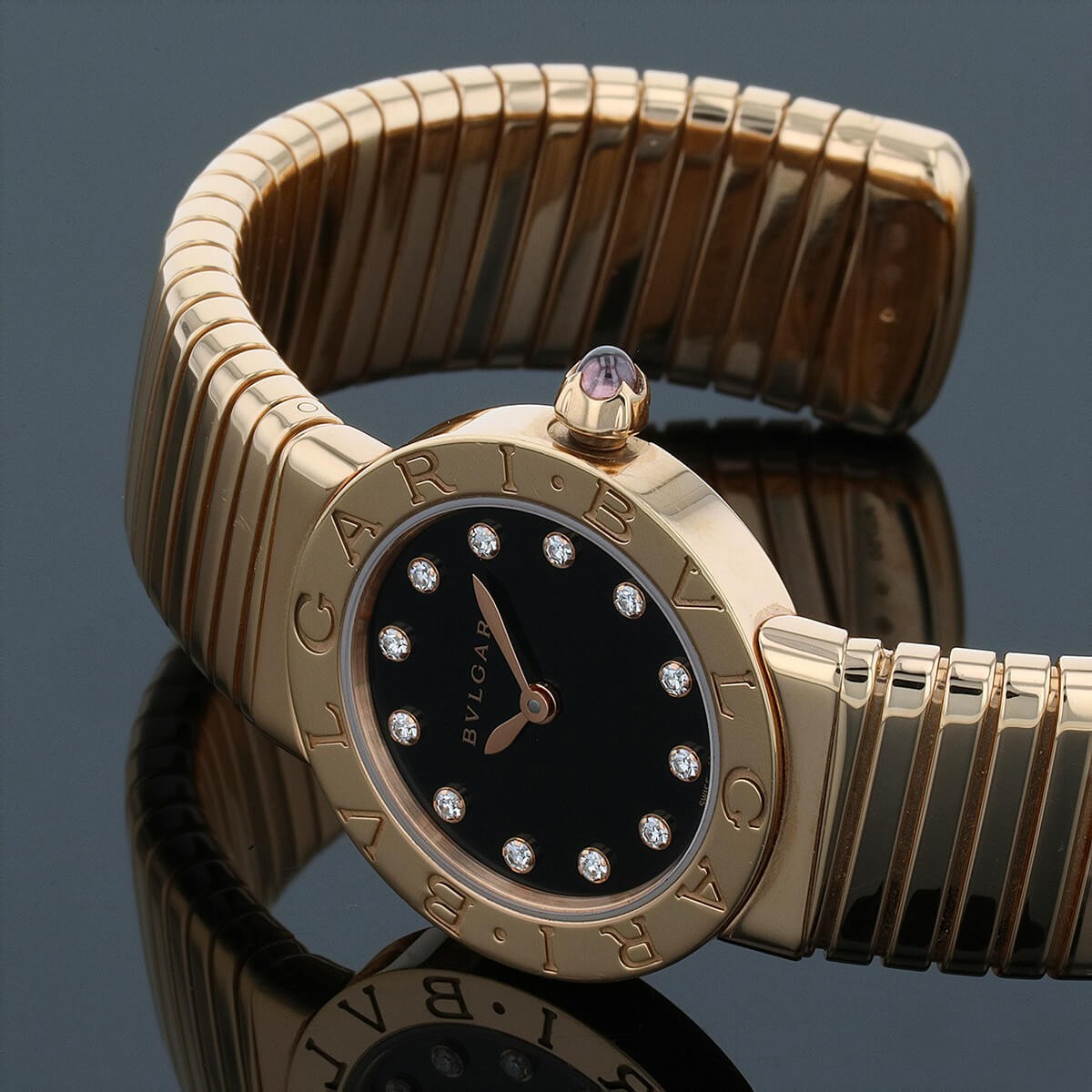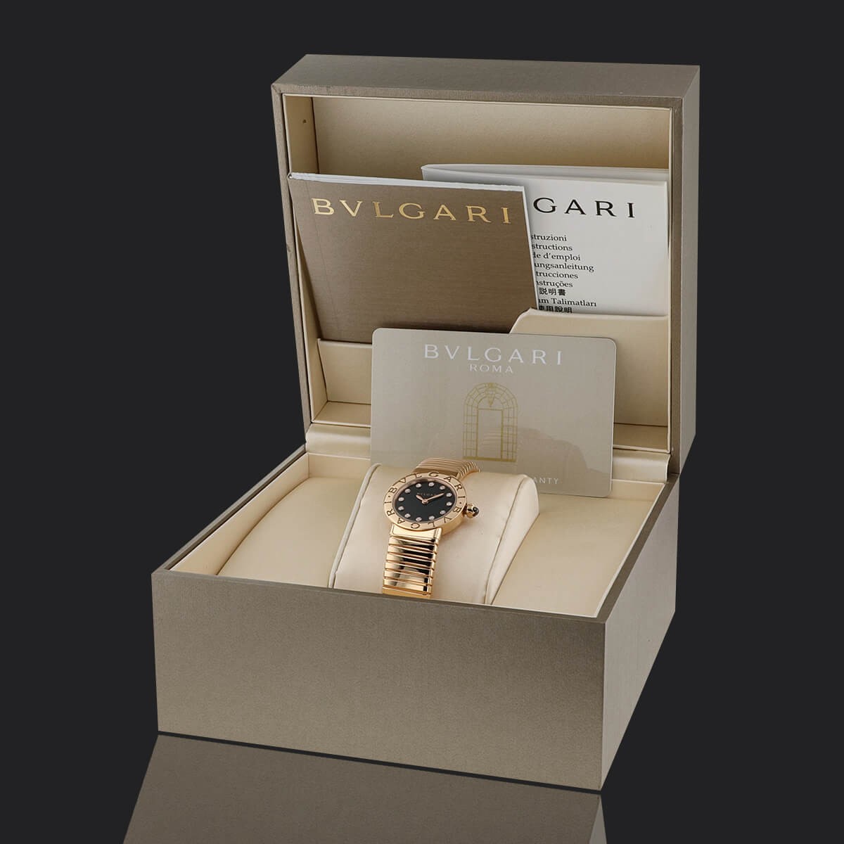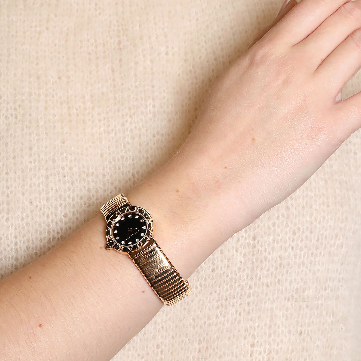 Montre bracelet de femme en or rose, cadran noir avec index diamants, lunette gravée Bvlgari. Mouvement quartz. Bracelet flexible en or rose, maille Tubogas. Signée et numérotée.