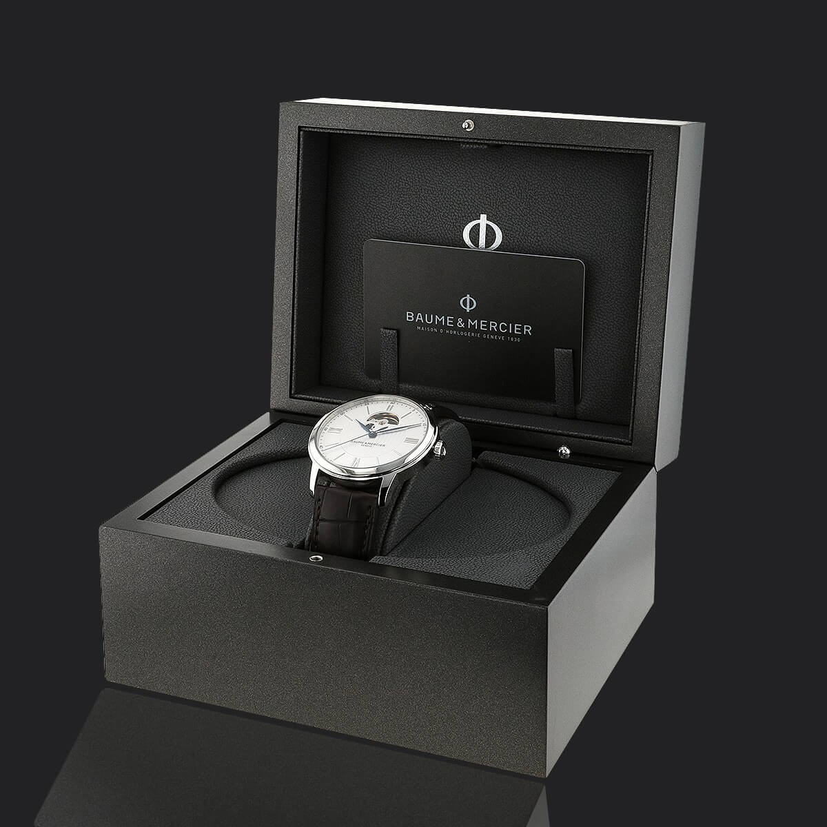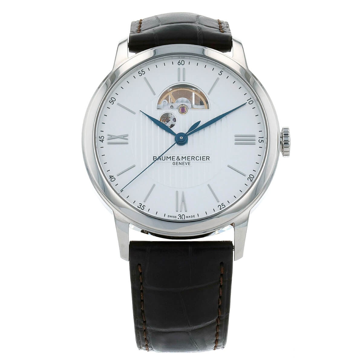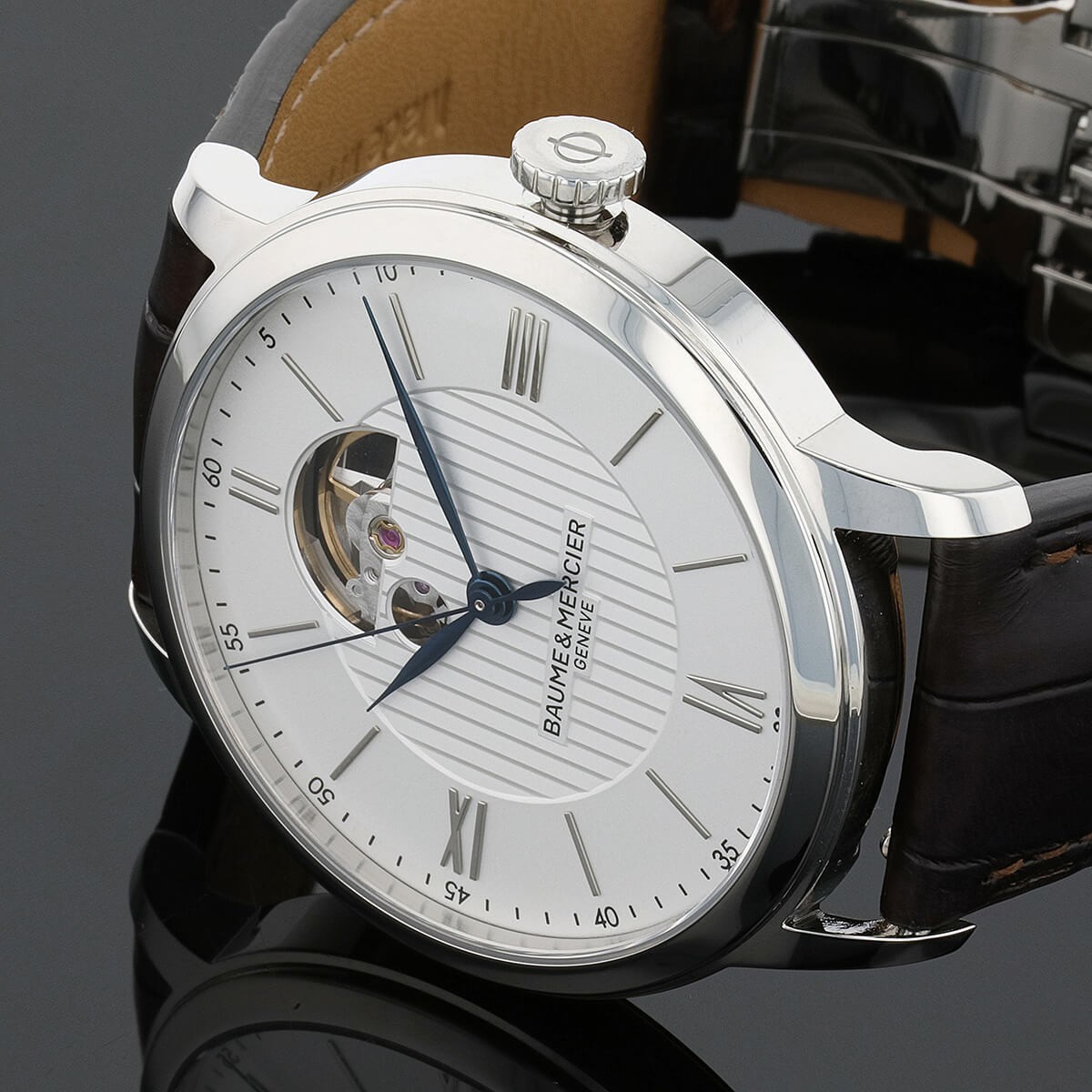 Montre bracelet d’homme en acier, cadran blanc avec fenêtre ouverte, chiffres romains et index appliqués. Fond de boîte transparent dévoilant son mouvement automatique. Bracelet en crocodile marron signé avec boucle déployante en acier signée. Signée et numérotée.