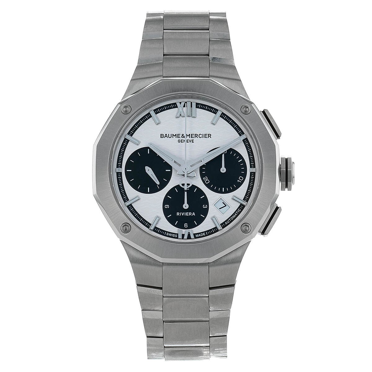 Montre chronographe en acier, cadran blanc stylisé 3 compteurs noirs, affichage de la date par guichet à 4 heures 30, lunette stylisée à décor de vis. Fond transparent laissant apparaitre son mouvement automatique. Bracelet en acier avec boucle déployante en acier. Signée et numérotée.